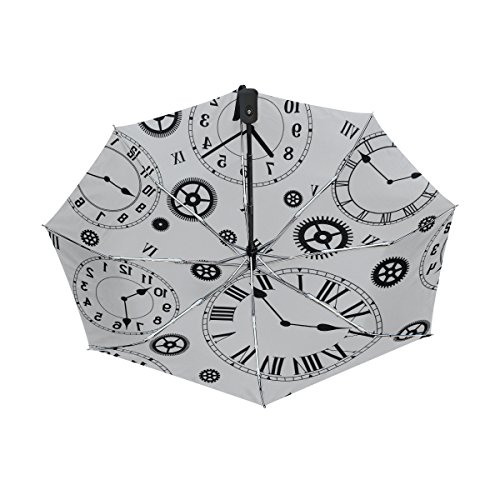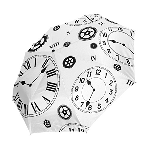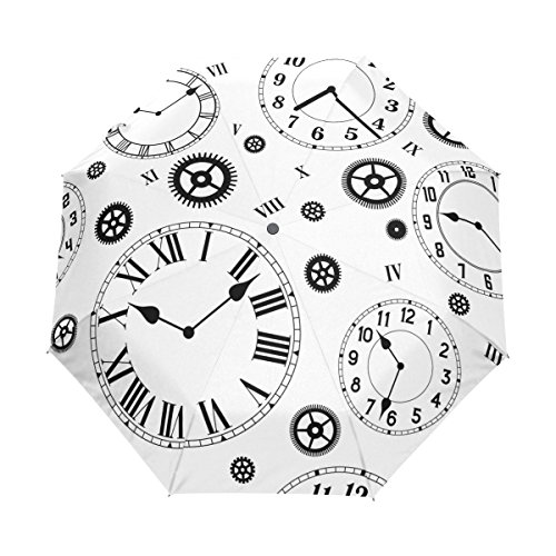 materials: made of 100% polyester pongee waterproof fabric. Weight: it is lightweight, 393g. Single-sided printing. Style: automatic open and close umbrella; foldable mini travel umbrella. Can be used on rainy and snowy day. Suitable for boys, girls, women and man. Feature: Light weight, small, portable. This Clock With Gear Pattern Black And White Colors folding umbrella is also a perfect Christmas gift, new year gift, and back to school gift. 0