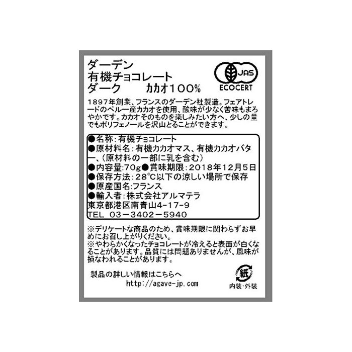 원본상품명: 有機チョコレト ダク カカオ 100% 70g