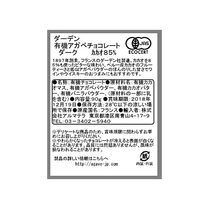 원재료명:100%(유기 카카오 마스(페루)고, 유기 카카오 버터(페루)고,(원재료의 일부에 젖을 포함한다)) 85% 70%(유기 카카오 마스(페루)고, 유기《아가베파우다》(멕시코)고, 유기 카카오 버터(페루)고, 유기 바닐라 파우더(마다가스카르)고,(원재료의 일부에 젖을 포함한다))