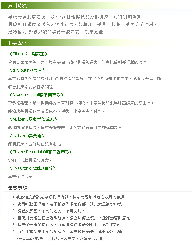 a-arbutin, Butylene Glycol, Glycerine, Isoflavon, Mulberry Root Extract, Bearberry Extract, Ellagic acid, Hyaluronic acid, Thyme Essential oil, ect...