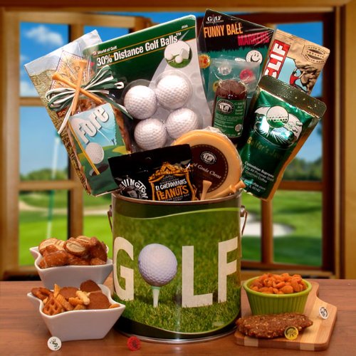-. Feature : Satisfy any golf lover with our Ultimate Golfers Gift Pail Golf Gift Basket / Our Ultimate Golfers Gift Pail Golf Gift Basket is the perfect gift for any occasion / This pail comes filled with golf keepsakes, peanuts, cheese and more / This gift come in reusable golf themed pail with lid / This gift basket comes packaged in cellophane and includes a handmade bow and personalized message!**Remember to mark "gift" box in checkout**