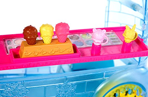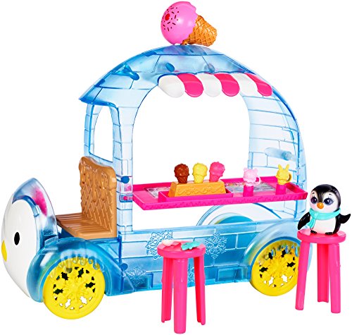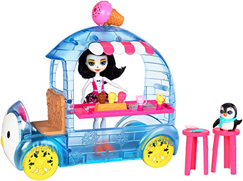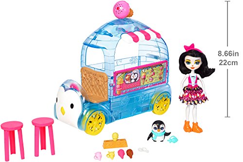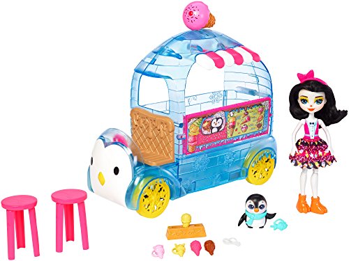 -. Feature : Roll into the world of Enchantimals with Preena Penguin doll, Jayla penguin and their Enchantimals ice cream truck and be enchanted! / The ice cream truck is so cool -- it's translucent blue and shaped like an igloo with brick details. Its yellow wheels roll, a pink ice cream cone decorates the top and a sign flips down to become a serving counter / The 6-inch doll fits in the driver's seat or behind the counter and is ready to serve up fun in a colorful outfit with bow and ruffle detail on the bodice, an ice cream print (with sprinkles!) on her removable skirt, orange shoes and a pink headband with bow / Preena Penguin doll has beautiful black rooted hair and sweet animal features that match her penguin friend figure. Jayla penguin has a blue scarf and wears an adorable expression! / Frozen treats, like different "flavored" ice cream cones and treats, plus a spoon, inspire imagination and storytelling. Some pieces have handles to fit on the doll's hand