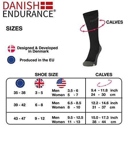 ALWAYS DESIGNED AND MANUFACTURED IN EUROPE: We do not believe in cheap Chinese compression socks or sleeves in poor quality with undocumented graduated compression created under poor working conditions. DANISH ENDURANCE compression hoses are always produced in Europe. The high quality stitching with anti-bacterial yarns guarantee amazing comfort and will ease your painful legs right away and make wonders during crossfit, fitness, triathlon, football / soccer, skiing or on long runs.