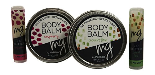 Gift Set includes: 1 Coconut/Lime body balm, 1 Mango/Peach body balm, 1 MG Coconut/Lime lip butter stick and 1 Mango/Peach lip butter stick in organza bag