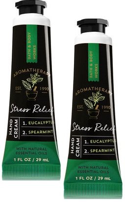 -. Binding : Misc. -. Brand : Bath & Body Works -. EAN : 0725984340071 -. Feature : 2 Pack hand cream Eucalyptus spearmint. 1oz / Eucalyptus spearmint:Eucalyptus Essential Oil clears the mind, Spearmint Essential Oil soothes & uplifts / With moisturizing shea butter and vitamin E. / Absorbs quickly to leave hands feeling soft, smooth and nourished. -. IsAdultProduct : 0 -. Label : Bath and Body Works -. Manufacturer : Bath and Body Works -. MPN : 0725984340071 -. PartNumber : 0725984340071 -. ProductGroup : Beauty -. ProductTypeName : BEAUTY -. Publisher : Bath and Body Works -. Size : 1 Ounces -. Studio : Bath and Body Works -. Title : Bath and Body Works 2 Pack Aromatherapy Stress Relief Eucalyptus Spearmint Hand Cream. 1 oz -. UPC : 725984340071