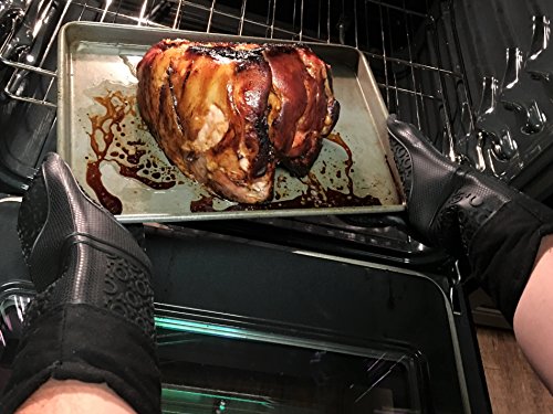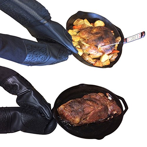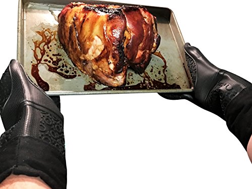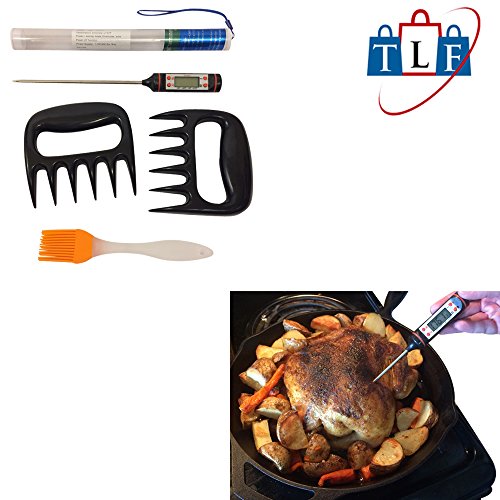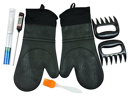 Best Oven Mitts Silicone 2 Black Gloves (Large) With 2 Meat Claws 1 Oil Brush 1 Meat Thermometer (4 in 1 Set) Complete Set For Kitchen Cooking Outdoor Grilling. Perfect Gift Combo For Family & Friends