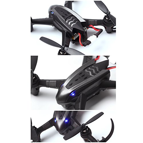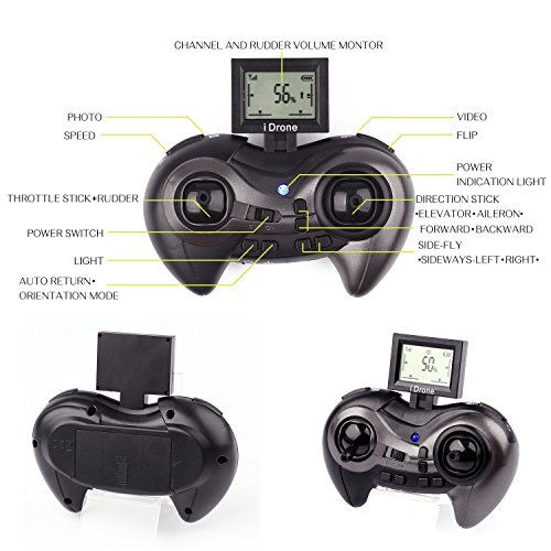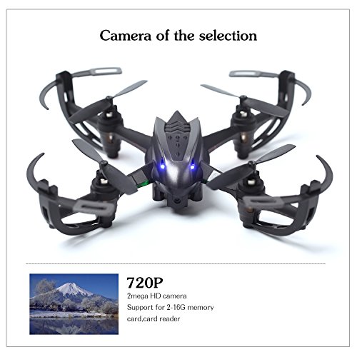 -. Feature : RC Drone with 2MP Camera(1280x720 Pixel),4 Kind of Sensitivity Modes for any level of player,Let you can change another wany keep happy at your side. / One Button to Return:Never get lost,Compass mode fused with the "one button to return" orientation mode will alow you to control the drone to fly safely to places even beyond your visiomn and return with a press of a button. / The RC quadcopter uses the 2.4GHz remote control technology, adopts the 2.4GHz remote control technology, and the operations become more accurate, the remote control distances become farther, the reactions become more sensitive. / Stable six-axis gyroscope: it has six-axis gyroscope inside,which can sense position change and accurately position, with easy hand throwing for flying. / RC helicopters with camera Function:hovering/360°Flips/up/down/left/right/forward/backward.