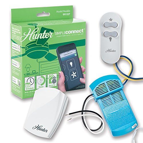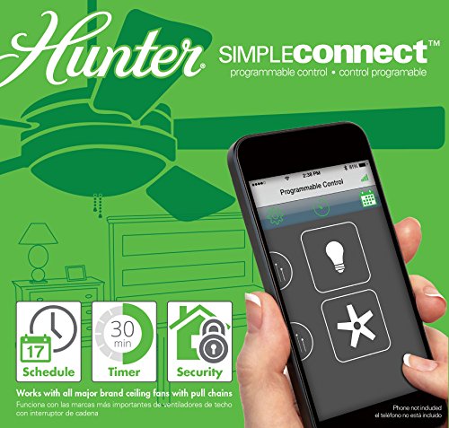 Hunter SIMPLEconnect is a programmable control that uses Bluetooth technology so you are able to control your ceiling fan with your cell phone. SIMPLEconnect works with all major brand ceiling fans with pull chains. With the scheduling function you are able to program you fan and go hands-free. With the sleep timer you are able to schedule your fan or fans to shut down shortly after you do. SIMPLEconnect also has a security feature that will turn your fan lights on randomly while you are away to help keep intruders away. Installation is easy. 1-Download the app. 2-Plug in the Bluetooth controller into a wall outlet. 3-Install the receiver in the canopy of the ceiling fan. The Bluetooth receiver has up to an 80ft range. SIMPLEconnect also has an on/off remote control. Phone compatibility - iOS 7.1 or higher, Android 4.3 or higher. Receiver dimensions, 4.5-inches x 2.5-inches x 1-inch. One year limited warranty. The app is available for download from the Apple App Store or Google Play.