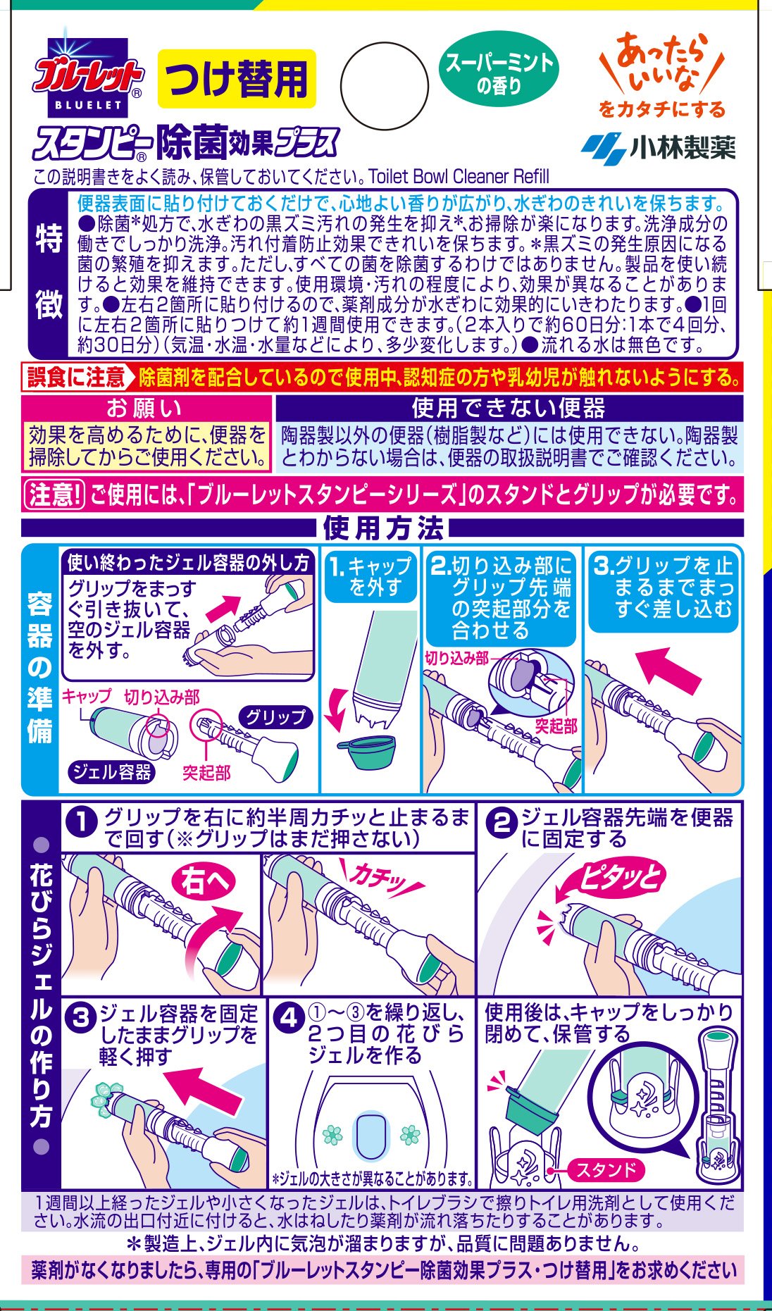 ● Fun flush toilet detergent to stamp on toilet bowl ● Fashionable main body container of white pearl with quantitative gel (with stand) ● Two left and right gel suppresses the occurrence of dirt on the water ● The comfortable fragrance spreads from the gel into the toilet space