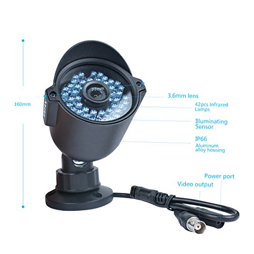 security camera system:(Surveillance DVR Kits): Firm quality TVI camera, 4 TVI 720P camera(with 3.6mm lens) for excellent video quality & clarity viewing; Cameras built in IR Cut Filter ensures true color. 1.0MP IR AHD Camera IP66 Outdoor/Indoor Camera Day/Night, 42pc LED IR Distance 131ft.