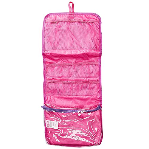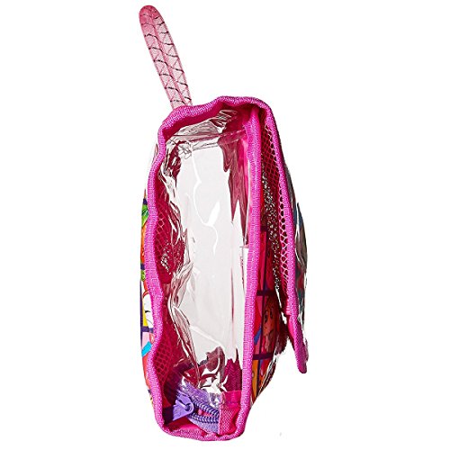 Inner compartments include a clear zipper pocket and multiple mesh pockets for storage