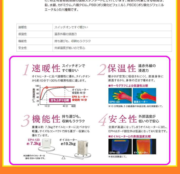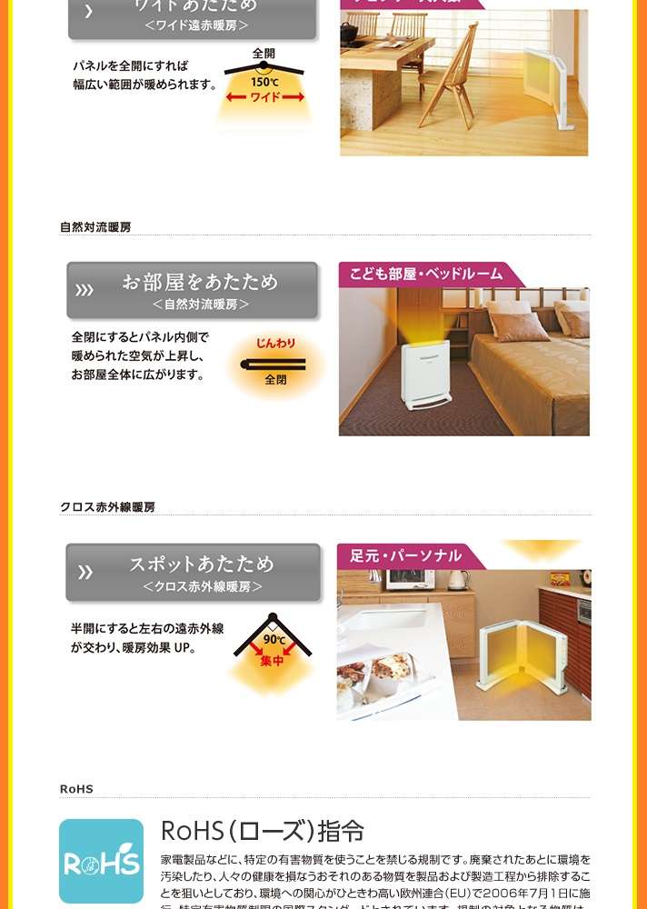 ●安全装置:過熱防止装置、転倒スイッチ、製品表面温度検知センサー、温度過昇防止装置、8時間オートオフ