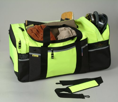 -. Feature : Hi-Vis Heavy duty gear bag / 900 denier ployester on PVC upper / Reinforced double PVC coated on nylon hard bottom / ID Pocket & reflective material for increased visibility / Sturdy webbing handles with Velcro closure, removable shoulder strap