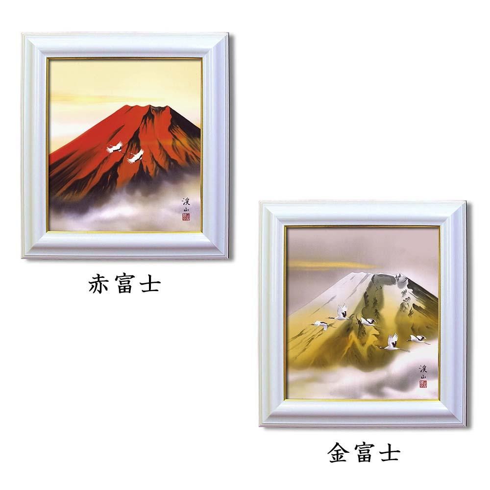 赤富士には開運力があり、金運を高めるとされるよりよい縁起物です。旭日の黎明を浴びて金色に輝く金富士の姿は、赤富士以上にめったに見られないことから、運良く見ることが出来た者には限りない吉事が訪れるといわれています。特に金運財運を高めると崇められ、富士信仰とあいまって、人々の憧れの象徴としてもてはやされてきました。お手持ちの色紙等と入れ替えが出来ます。 |