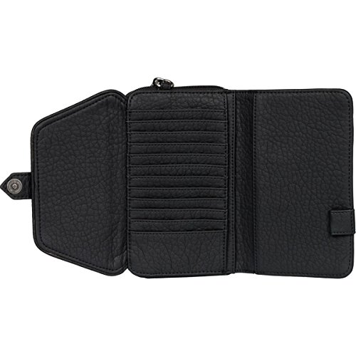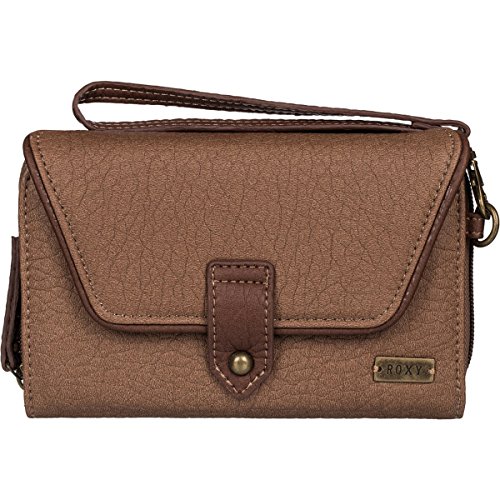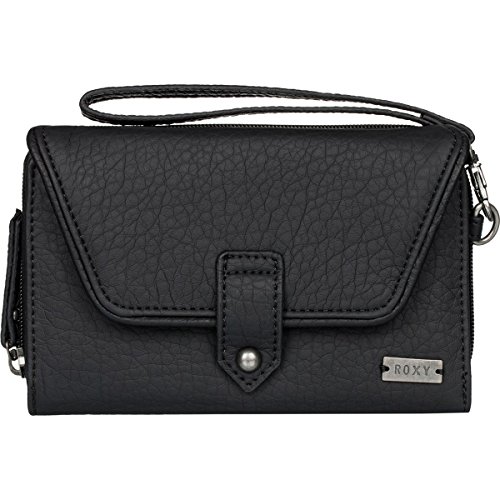 Faux-leather checkbook wallet with two large compartments, first is accessed through magnetic snap closure and oipens up to multiple card holders and section for documents, second large compartments is accessed through zip around and features sections for documents with zipped compartment, fits most cell phone, detachable wrist strap and roxy metal plate. 100 % Polyurethane.Feature
