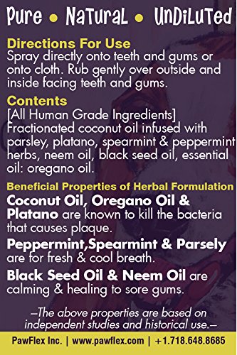 -. Feature : 80 PERCENT OF DOGS OVER THE AGE OF THREE HAVE DOG GINGIVITIS: Plaque or tartar buildup will cause your dog to have sore or swollen gums. The all natural ingredients we have included in this product (coconut oil, oregano oil and platanto) are known to kill that bacteria that causes plaque buildup. / GREAT FOR PUPPIES: Get your pet used to oral care when they're young, you'll have a much easier time brushing their teeth when they're older. This gentle spray is perfect for pups who can't sit still or are apprehensive about teeth brushing. Teach your dog there's nothing to fear about brushing time! Works great for dogs of any breed, fur type or age. / ALL-NATURAL INGREDIENTS: There are no toxic chemicals or unnecessary ingredients in our Wickedly Potent! Oral Care Mouth and Teeth Spray . We use all human grade, vegetarian ingredients. All of our ingredients are simple and safe: Fractionated Coconut Oil infused with Parsley, Spearmint & Peppermint herbs, just to name a few! Perfect for all breeds and sizes. / IDEAL FOR COMFORT FROM SWOLLEN OR SORE GUMS: The Black Seed Oil and Neem Oil is all natural and calming. It will help to heal those sore gums and have your pup running around happy again! / CHECK OUT OUR ALL NATURAL DOG TOOTHPASTE: Holistic and free of any lab-made chemicals, crafted wholly for fighting plaque, whitening, cleansing and soothing with a mild clean flavor for fresh breath.