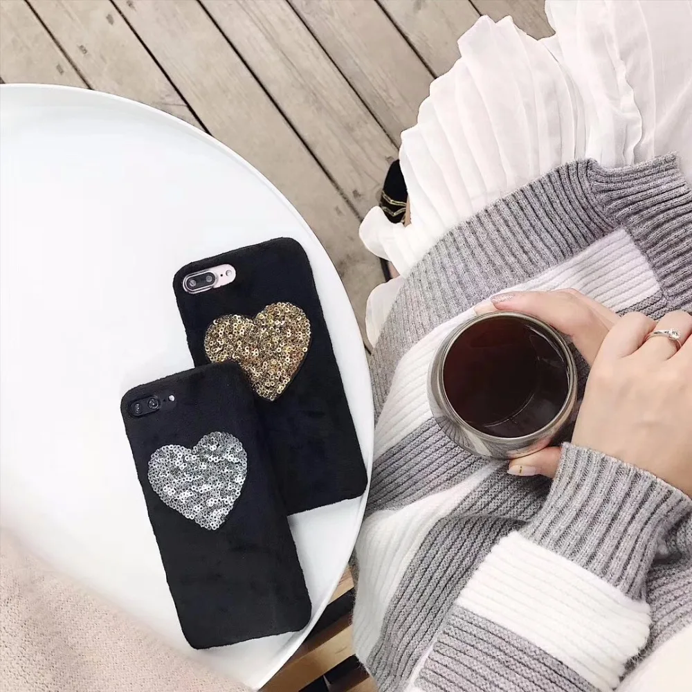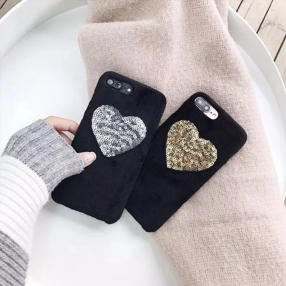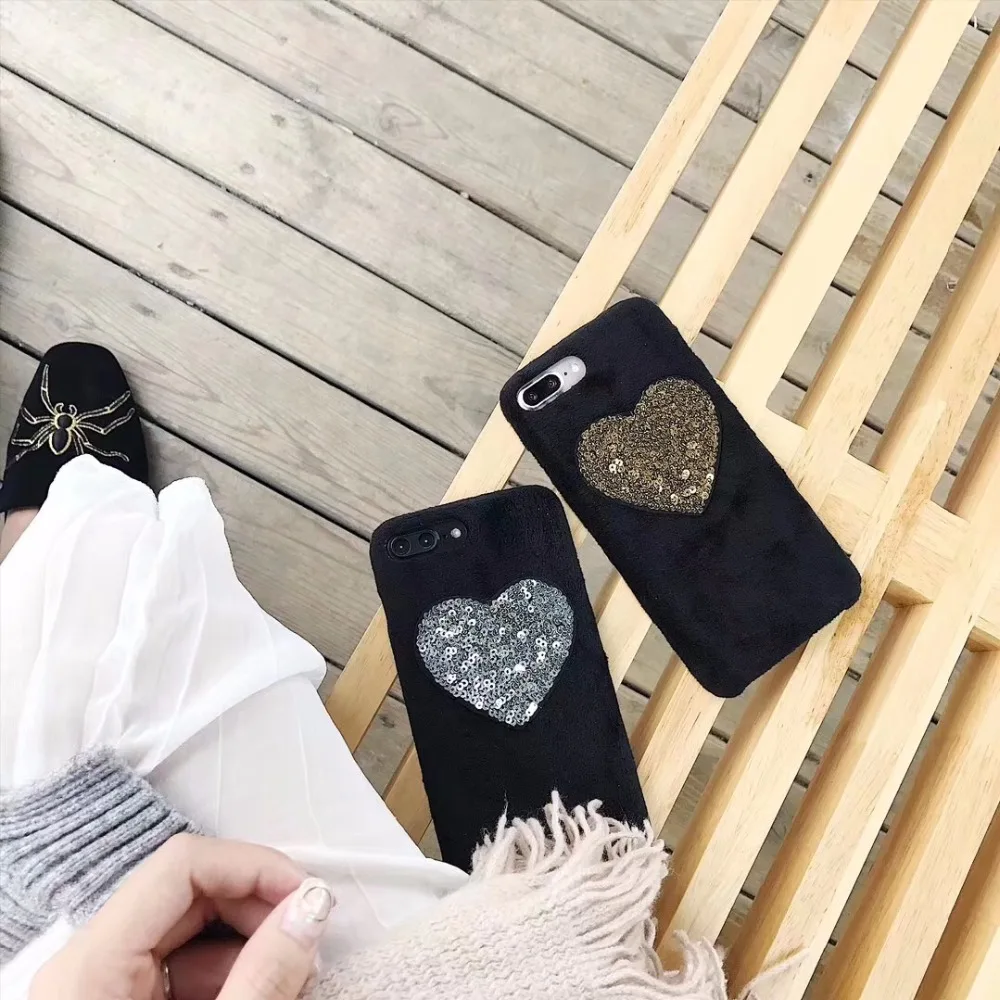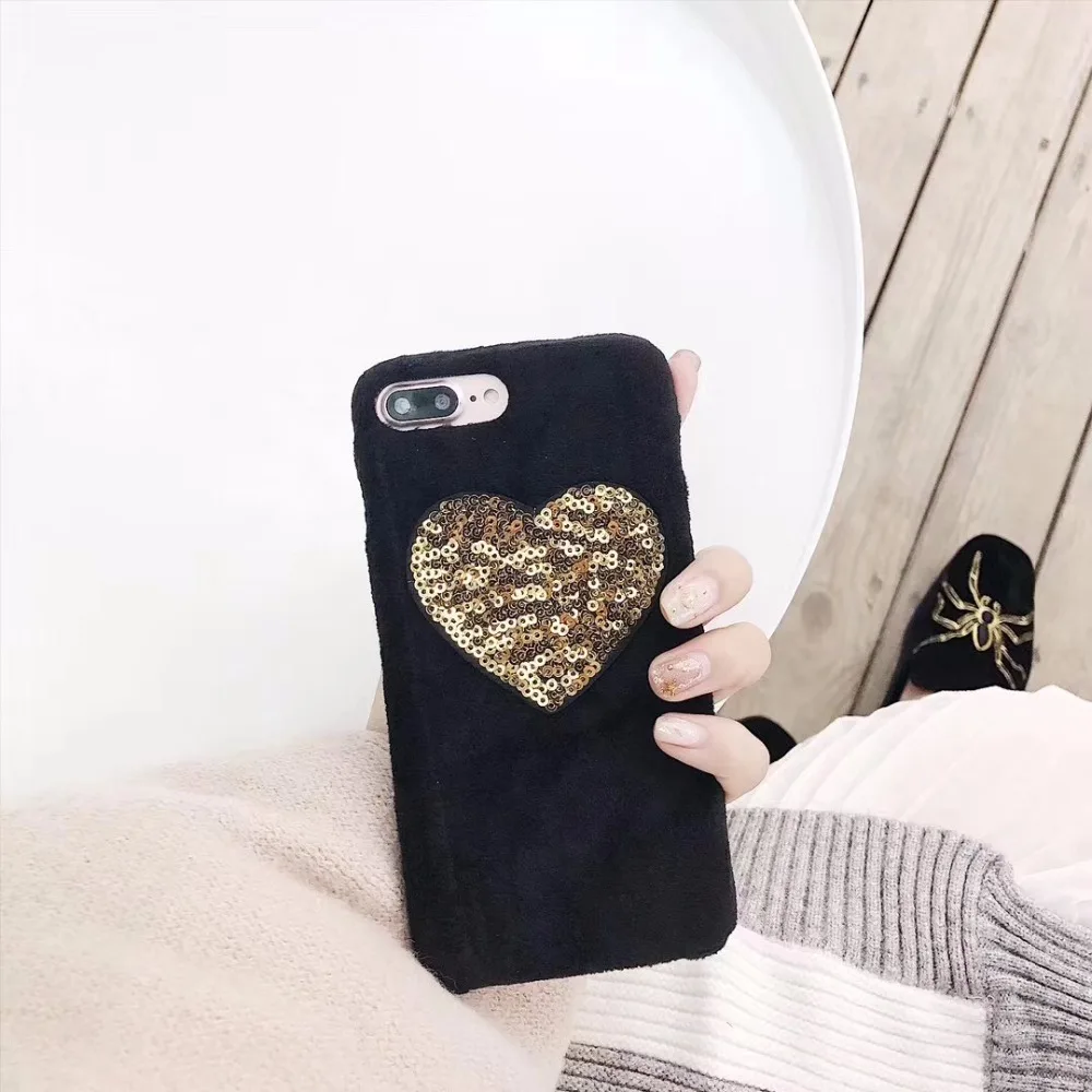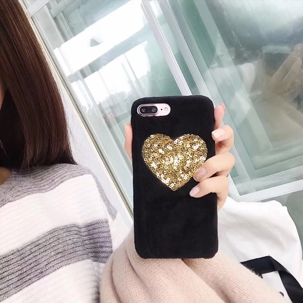design5:gold heart fur puff case cover for iphone 7 7plus 6 6s plus