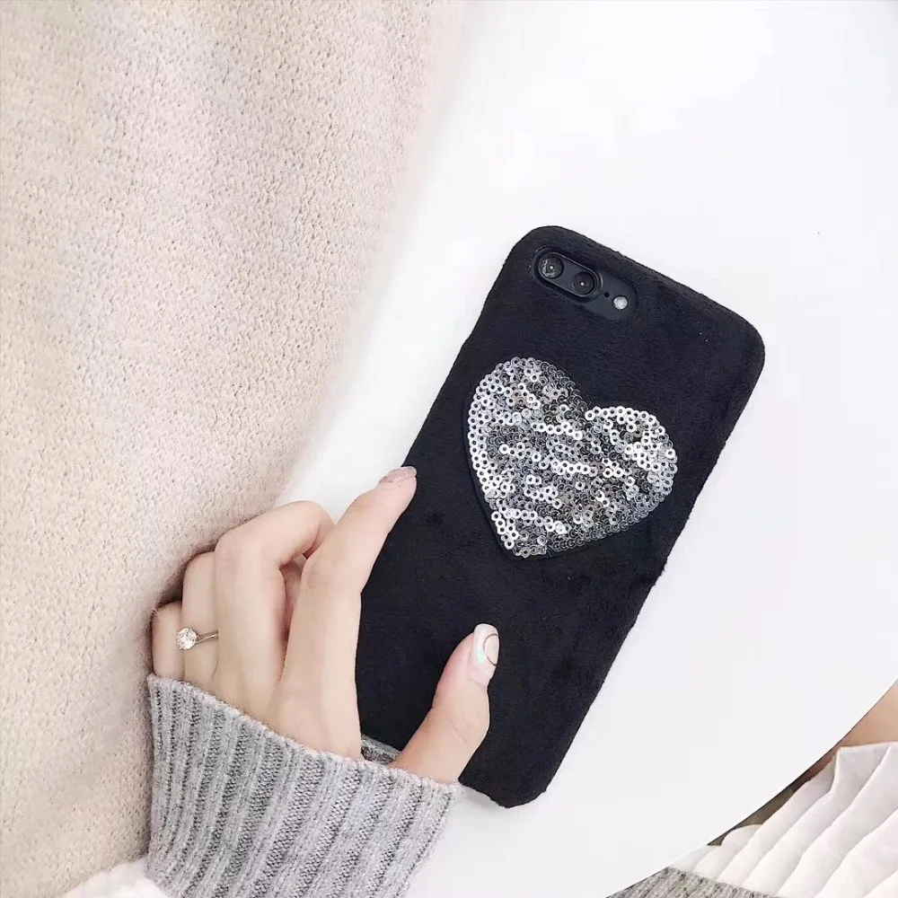Features:luxury cute fashion exlusive diamond heart embroidery fur puff case