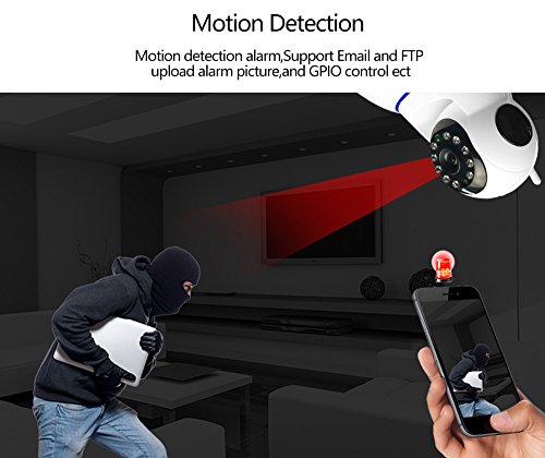 -. Feature : ❦960P HD IP Camera Home Guard: 960P HD LENS/Mobile phone remote/Two-way voice detection alarm/Replay Theater. Smartphone Remote View/Two-way voice: No matter where you are, you can see your family anytime, anywhere. / ❦360°full viewing angle: Double bearing design, smooth moving. Wide angle rotate, no blind area, remote control. / ❦RECORDING PLAYBACK FUNCTION: Retrieval of surveillance video at anytime, never miss any detail. Infrared night-vision light: Ensure to get clear image even in dim and dark environment. / ❦One key connection:Only 15 seconds to view camera. Support up to 64G Micro card memory: Support up to 64G Micro card storage, 24-hours recording. / ❦Multi platform multi-user viewing: Support 4 online users viewing simultaneously, Support Android, IOS, Ipad, PC computer view. Motion Detection: Motion detection alarm, support Email and FTP upload alarm picture, and GPIO Control etc.
