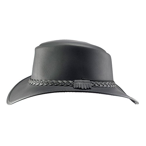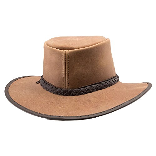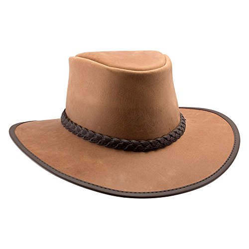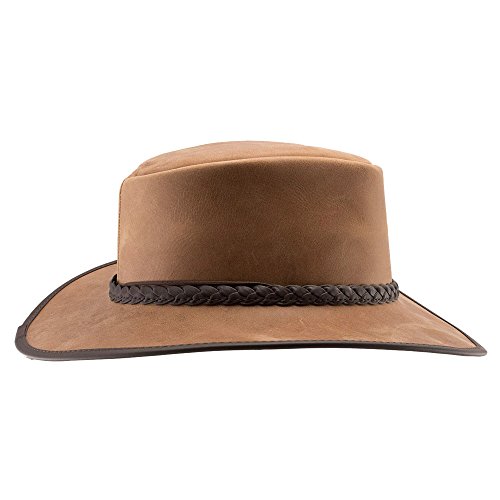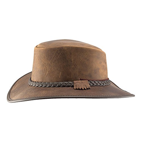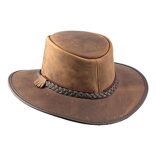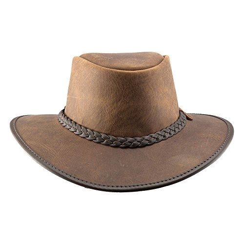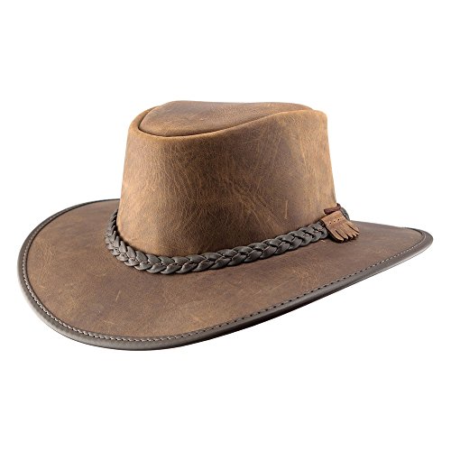 Product Description A hard-working hat with Outback style. The durable Bravo is soft and flexible enough to handle crushing and abuse while maintaining its custom shape. The full grain, smooth finished distressed cowhide is complemented by an edge braided band and brim trim for a great looking finish. A hat you can wear all day, every day. 0