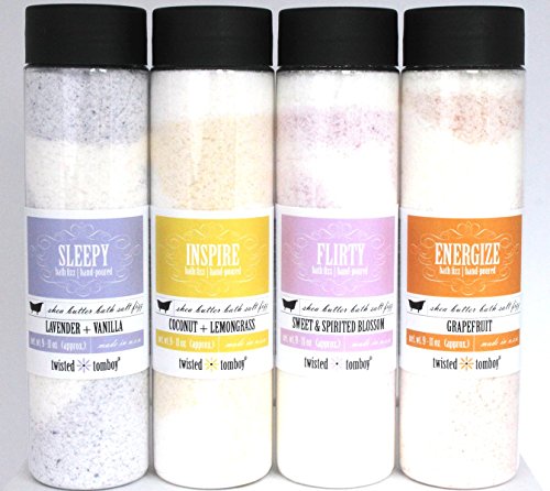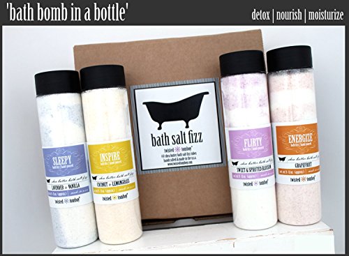 -. Feature : Pamper yourself with a bath full of natural 'superfoods' for your skin such as shea butter, sea salt, epsom salt, sunflower oil, etc. / 4 mind & body healing scents included: 'sleepy' (lavender & vanilla), 'inspire' (coconut & lemongrass), 'energize' (grapefruit), 'flirty' (sweet & spirited blossom) / What is a bath salt fizz? Simple. Think bath bomb in a bottle! SP.R.Inkle desired amount of bath fizz into warm bath. Our bath fizz will dissolve releasing wonderful aromas, moisturizing oils and detoxing ingredients. / Each 4-pack contains (4) 9-12 oz. net wt. tubes packaged in a 100% recycled craft gift box. / Handmade in the U.S.A.