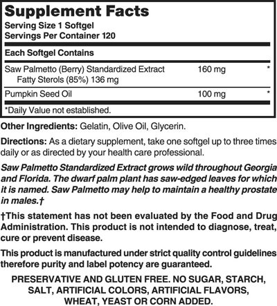 -. Binding : Health and Beauty -. Brand : Nature's Blend -. EAN : 0079854006728 -. Feature : All Natures Blend Products are American Made / Preservative and Gluten Free / No Starch, Salt, Artificial Flavors or Colors, Wheat, Yeast or Corn Added! -. Label : National Vitamin Company -. Manufacturer : National Vitamin Company -. MPN : 672 -. PackageQuantity : 1 -. PartNumber : 672 -. ProductGroup : Health and Beauty -. ProductTypeName : HEALTH_PERSONAL_CARE -. Publisher : National Vitamin Company -. Studio : National Vitamin Company -. Title : Saw Palmetto 160 mg 120 Sgels -. UPC : 079854006728