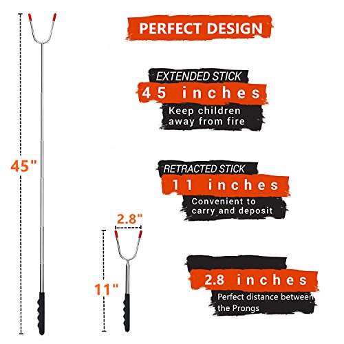 SAFE FOR YOU AND CHILDREN - 45" Extra Long extendable telescoping forks keep you and kids at a safe distance from any patio fire pit, backyard fire pit, bonfire pit, or campfire. The prongs’ sharp tips are protected with rubber, making them perfect for handling around children and making them a must have for any BBQ.