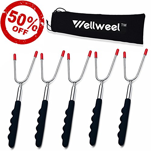 Marshmallow Roasting Sticks Smores Hot Dog Forks BBQ Skewers 45" Extra Long Telescoping Extendable Smores Skewers - Fire Pit, Camping, Campfire, Bonfire & Outdoor Cookware Kit (5 set)