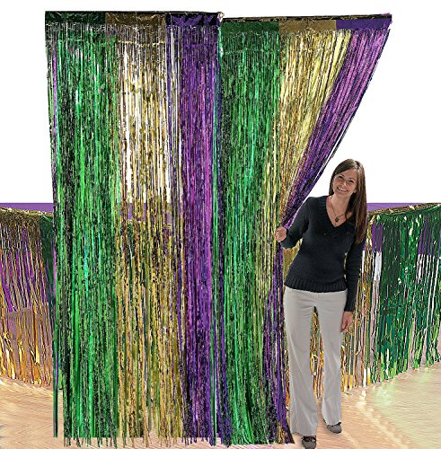 - Mardi Gras Party Decoration Set, 1) Foil Mardi Gras Fringe Door Curtain 2) Foil Mardi Gras Fringe Table Skirt,