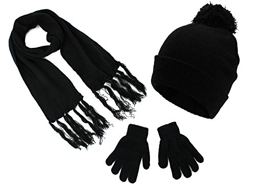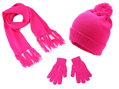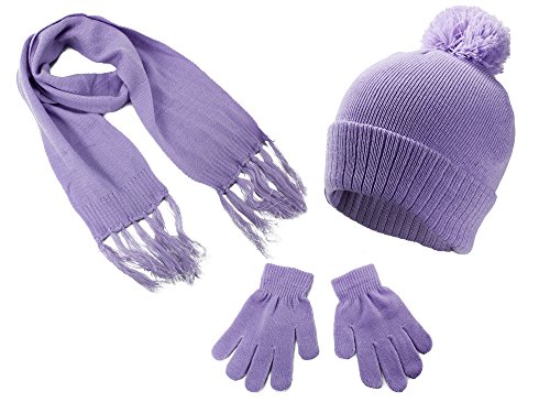 With its thick cozy fabric, your child will surely snug in comfort as she enjoys the cold, chilly weather. Whether she's playing outside, walking down the street, or having a dinner with the family on a cold night, this hat, scarf, and gloves set is up for anything. The knit beanie hat features a warm pompom design that add a fashionable statement to any type of winter ensemble. The knitted pair of gloves has elastic cuffs that fit your girl's hands, leaving her a toasty sensation. And a knitted scarf provides warmth to her chin and neck. Never worry of a wrong size as these accessories fit most body frames of children, so your girl can use them in the long run. 0