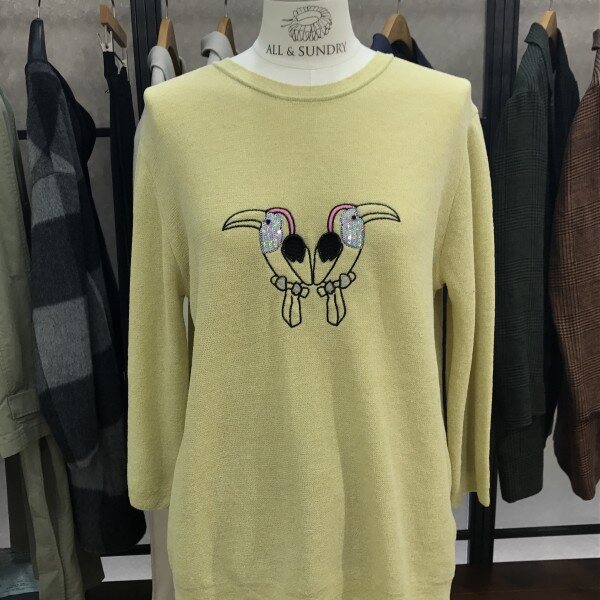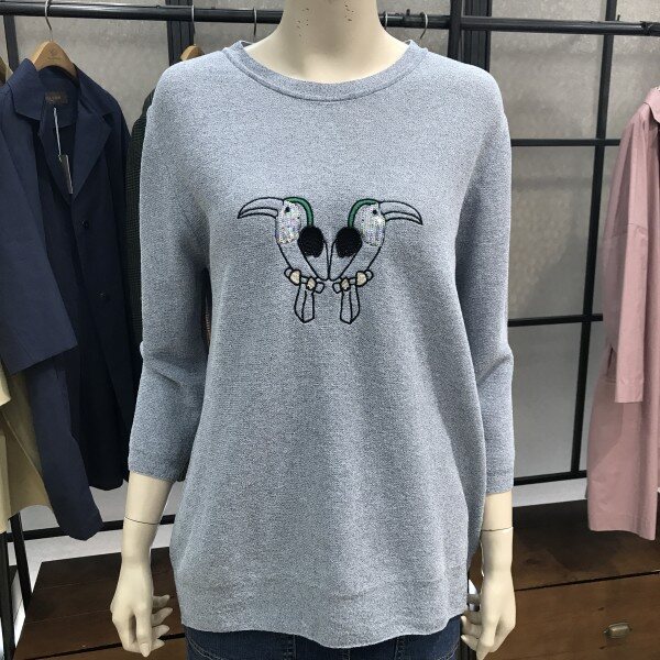 새 그림이 예쁘게 장식 되어있는 라운드넥 니트입니다. 옆에는 트임이 있어 바지나 치마안에 편하게 넣어입으실 수도 있어요~ 멜란지블루 컬러는 실제로 그레이색감에 가까워 데일리로 코디하시기 좋구요. 라이트옐로우 컬러는 봄에 화사하게 입기 너무 좋답니다. 총장길이는 55사이즈 기준으로 65cm입니다.