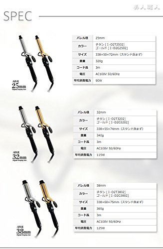 가벼움과 기능성을 겸해 같게 했다고데기ivy《루》D2아이런 38mm 가벼움과 기능성을 겸해 같게 했다고데기입니다.최고 온도190℃까지 설정 가능해서,사용 시간을 단축할 수 있는 프로 유스의고데기.가벼워 열전도 이 뛰어난 알루미늄을 배럴 채용하고, 경량화로 성공!어깨나 손목 등에의 살롱 워크의 부담을 줄일 수 있습니다.고품질 히터 사용으로,배럴의 끝 중앙 근본에 온도로 차이가 나오지 않아배럴과 클립에 균등하게 열이 전해지고, 마무리되게《무라》가 나오지 않습니다.또한배럴과 클립의 양방에 내마모 성내약품성 이 뛰어난 특수 코팅이 세워져 있으므로,상품의 열화(품질이나 성능 등이 나빠짐)를 막는 동시에,머리카락의 슬라이딩이 향상.온도 설정의 오작동을 막는 홀드 스위치,손가락에 부담이 걸리지 않는 클립 레버나,손끝을 열로부터 지키는 쿨 팁(칩) 채용 등,사용하기 쉬움으로도 배려되어 있습니다. ■롱 프레스 기능오 작동 방지 이기 때문에,롱 프레스 기능을 채용.1.5 초사이의 길이 누르기에 전원 버튼이 작동합니다. ■롱 배럴 유효역105mm의 롱 배럴은 긴 머리카락에서도 달아나지 않습니다. ■간단 온도 설정 온도는 80℃~190℃까지 설정 가능.10℃잘게 썰고 머리의 상태나 스타일 에 맞게 한 설정 를 할 수 있습니다.온도나 설정이 한 눈에 알 수 있는 액정 디스플레이로도 되고 있습니다. ■안전 대책도 확실히이라고 ■슬립 모드 오토 파워 오프 기능이 무심코(그만) 있습니다. 마지막 조작부터 약1시간 경포 본체의 전원이 오프 입니다.※액정 디스플레이에는 스텐바이 모드【- -】가 표시됩니다. ※전원이 오프가 되어도 액정 디스플레이의 백 라이트는 점등 하고 있습니다. ※홀드 스위치가 온 시에는 온도 설정 버튼의 조작은,마지막 조작에 포함되지 않습니다. ■에러 모드 온도가 상승 하지 않는 등,아이런 내부에 불편이 생긴 경우는 액정 디스플레이에 에러【Er】가 표시됩니다. ■메모리 기능 통전간은 설정 한 온도가 기억되어 있습니다. 플러그를 콘센트부터 제치면,다음으로 통전 했을 때는 초기 설정 온도180℃에고 돌아오(가)습니다. ■사양 배럴경:38mm 컬러:티타늄(티탄) [1-D2T3802] 골드 [1-D2G3802] 크기:338×60×75mm(스탠드 포함하지 않아) 중량:365g 코드 길이:3m 전압:AC100V 50/60Hz 평균 소비전력:125W