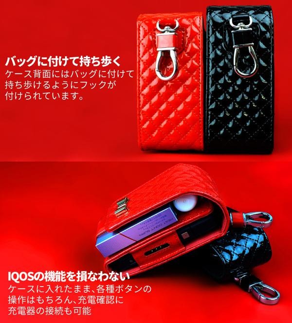 艶のあるエナメル生地に柔らかいキルティング加工を施したアイコスケースです。これ一つでアイコス本体とヒートスティック、クリーナーも全てコンパクトに持ち歩けます。ケース背面にはバッグに付けて持ち歩けるようにフックが付けられています。ケースに入れたまま、各種ボタンの操作はもちろん、充電確認に充電器の接続も可能です。 |