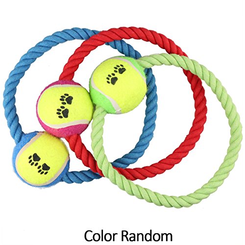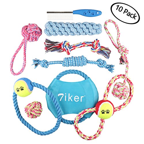 Perfect for Tug and Toss Games,it contains assorted 10 dog toys(Interactive toys,squeaky toys,spinose loop toys,ropes toys,chew toys,frisbee toys,Dog Toy Balls,the color in our image randomly)