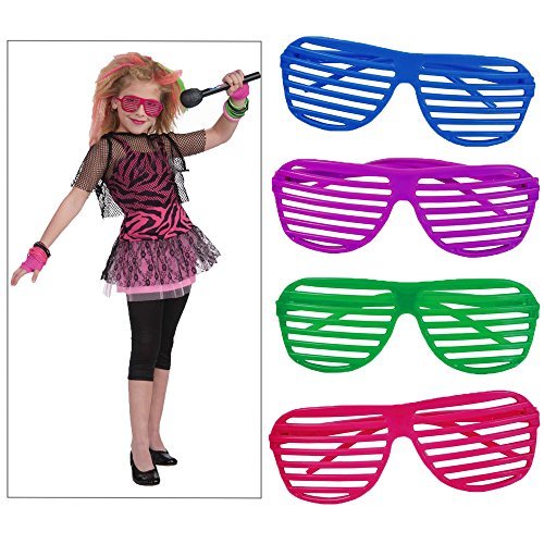 -. Feature : 36 pieces Stylish slotted sunglasses. / Made with tough 6" plastic material that can last long in any harsh handling. / Fun neon colors of pink, purple, green and green especially made to color and brighten up your parties. The sunglasses are great for 80's themed party, disco party, birthday party, stage play, rock star costume and any matching parties. / Serves as an excellent gift for children and also a perfect party favors. / The Sunglasses can fit well in adults and children.