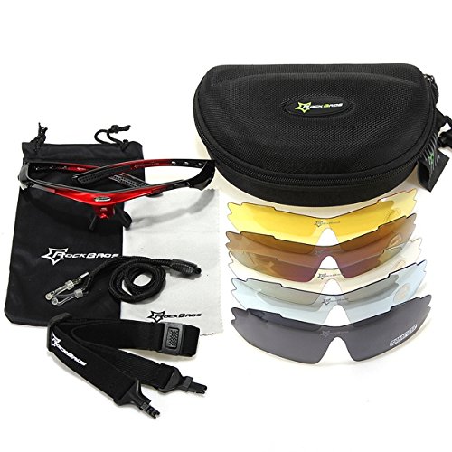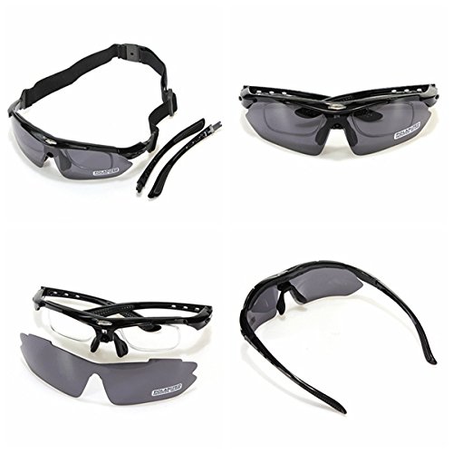 - Feature : Features: Incredibly lightweight contributes to the comfort of eyewear and you may even not feel wearing it. Frame is made of thermoplastic, the perfect material for eyewear, which makes the glasses has excellent flexibility and durability. Lenses are made of polycarbonate which is also used in bullet-proof glass, riot shields, and astronaut helmets, extremely high impact resistance. / Polarized lenses are made in injection process, not only to perfect lens shape, but also to decrease eye fatigue and increase comfort for eyes. Inherent UV protection, Block 100% of UVA, UVB /UVC rays, and harmful blue light to 400nm / 5 Interchangeable lens, with different colors, allows you to choose the best fitted one. Adjustable nose pads are available to customize the fit of your glasses. Anti-skid foot stripe, streamlined design, provides you a fashion style. Suitable for riding/cycling, outdoor activities, mountaineering, tourism. / Specification: Frame Material: Thermoplastic Lens Material: Polycarbonate Frame Color: Black,White, Red, Blue Lens color: black, transparent, yellow, blue, brown (picture description has the specific illustration of the usage of different lens) Dimension: lens lenght(150mm), lens width(40mm), bridge width(30mm), temple foot length(115mm) / Package included: 1x Pair of polarized lenses (Please note that there are 5 lens, one is polarized lens, and other four ones are UV lens.) 4x Pairs of UV lenses 1x Inner myopia frame (shorsighted frame) 1x Polarized lens test card 1x Glasses headband 1x Glasses rope 1x Glasses cloth 1x Glasses bag 1x Glasses case