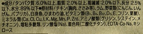 原材料:チキン(胸肉、ささみ等)、ラム、野菜類(にんじん、いんげん、パプリカ)、白身魚、ひまわり油、ビタミン類(B1、 B5、 B12、 D3、 E、 コリン、葉酸)、ミネラル類(Ca、 Cl、 Cu、 I、 K、 Mg、 Mn、 P、 Zn)、アミノ酸類(グリシン、システイン、メチオニン)、増粘多糖類、リン酸塩(Na)、着色料(二酸化チタン)、EDTA・Ca-Na、キシロース