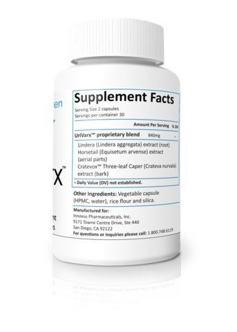 -. Feature : UriVarxTM is a dietary supplement composed of a proP.R.Ietary patented blend of synergistic herbs to help promote and support healthy bladder function; by reducing frequency and helping maintain control. / UriVarxTM contains botanical ingredients: Lindera (Lindera Aggregata) Extract, Horsetail (Equisetum Arvense) extract (Aerial Parts), and Cratevox Three Leaf Caper (Crataeva nurvala) extract (bark). / Research sests that Horsetail may promote healthy urinary tract function, Crataeva can enhance bladder tone and Lindera provides antioxidant and anti-aging effects for the bladder and urinary tract. / Manufactured by Innovus Pharma in an FDA registered facility that adheres to CGMP and NSF standards. Made in the USA.