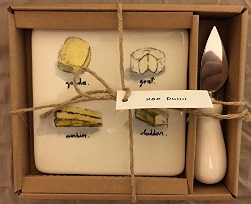 Rae Dunn Artisan Collection Cheese Board (5" X 5") With Images of Morbier, Cheddar, Goat, and Gouda Cheeses Includes Spreader Dishwasher Safe