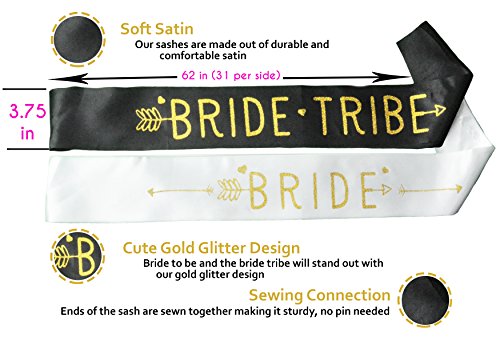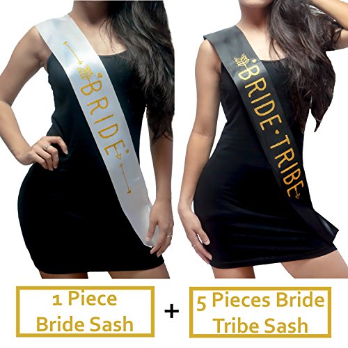 VALUE. This bride sash bachelorette set has 1 white sash for the bride to be and 5 black sashes for maid of honor and bridesmaids.