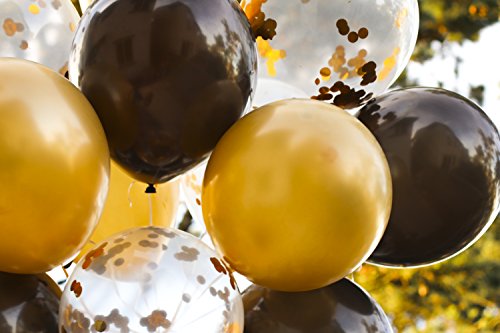 IMPRESSIVE SET OF 15 GOLD, 15 BLACK, 10 CONFETTI BALLOONS is exactly what you need for birthdays, baby showers, graduations, anniversary, family celebration, bachelor or bachelorette party and much more. The spectacular blend of favorite black, gold, and clear balloons with gold silver confetti inside is an amazing thing to see. WE PUT THE CONFETTI INSIDE the clear balloons. This makes inflating them much easier. Others make you put the confetti in the balloon yourself. That can be tedious and messy. So we send these to you with the confetti already inside. This greatly reduces the amount of time needed to get this beautiful balloon bouquet ready and looking great for your event or celebration. THICK, RUGGED, DURABLE LATEX BALLOONS that are the best in the industry. These don't puncture nearly as easy as traditional balloons. They also hold their air for a lot longer. You can enjoy these balloons for days after your party . Even though they are tough, they only weight a very light 2.8 grams. That's less than the weight of 3 paperclips. 100% MONEY BACK GUARANTEE ensures this will be your best bet for a no-risk purchase. Many people love this set so much they return to buy 1 or 2 more. HURRY AND BUY NOW while we have a new shipment in stock. They make a much appreciated gift for friends, family, and co-workers - anyone who loves fancy party balloons! 0 |