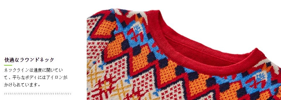 着やすいラウンドネックと、個性的な幾何学柄のデザインが上品に仕上がっています。