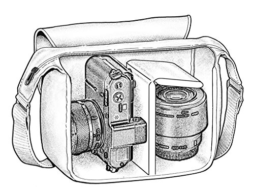 Stylish handbag-style camera bag that holds a professional compact camera or most mirrorless cameras with a lens attached, an extra small lens, and a flash