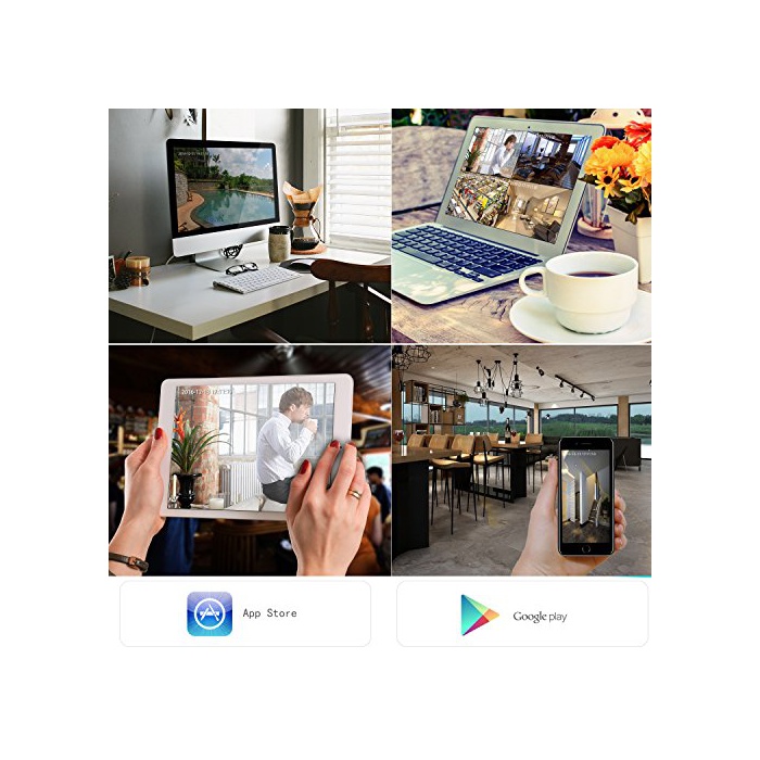 「4CH비디오 감시DVR」:TV나 데스크탑 모니터 등의 VGA또는HDMI접속을 사용하는 모든 모니터와 호환성이 있습니다.USB백업 기능,아날로그 카메라,IP카메라,AHD카메라를 서포트