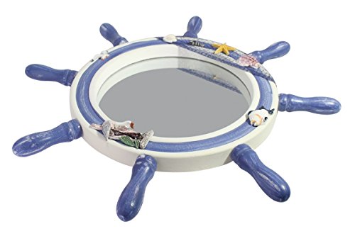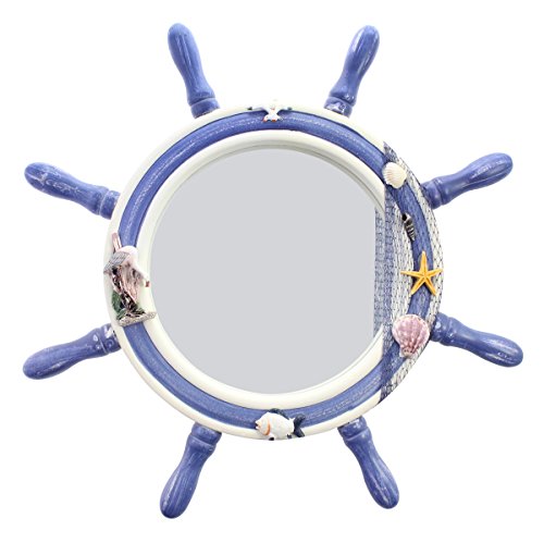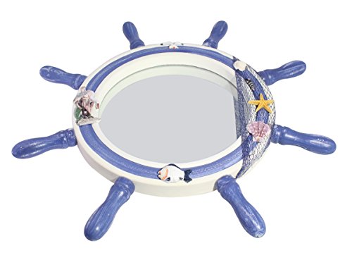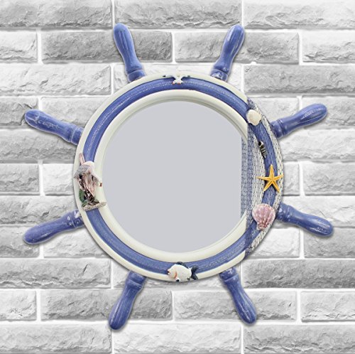 JustNile Mediterranean Nautical Theme Distressed Vintage Retro Wood Frame Wall Mirror- Blue And White Helm Steering Wheel With Net