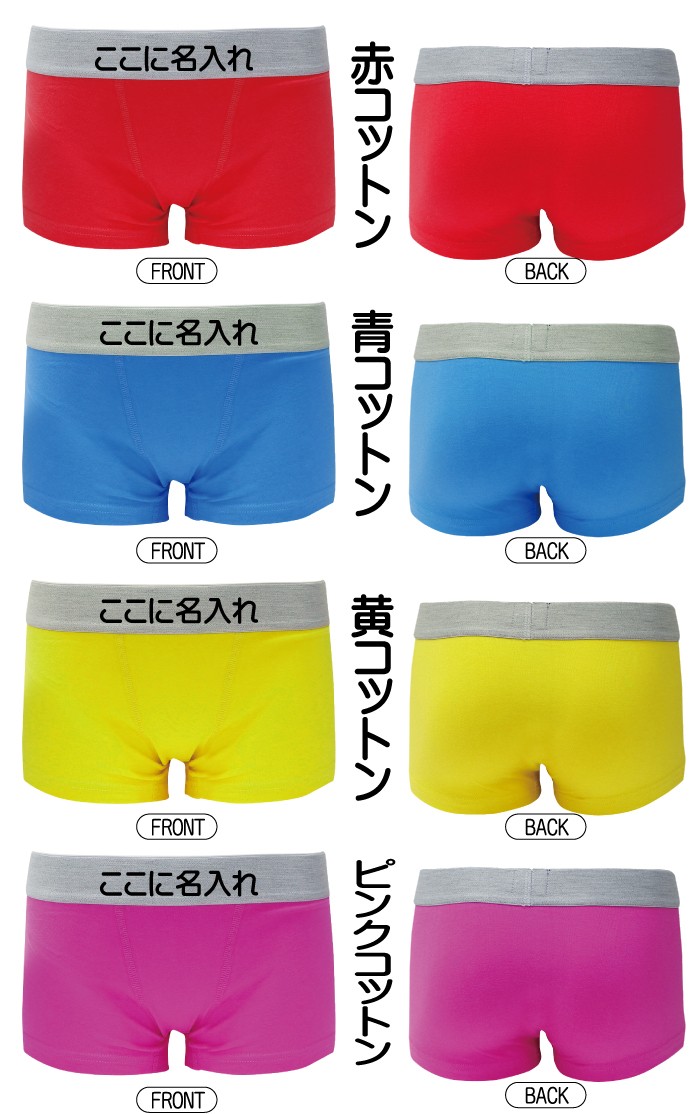 選べる6カラーのボクサーパンツのウエストゴム部分にお好きな文字を8文字まで名入れ(オリジナルプリント)致します。文字は黒色になります。※特殊文字は避けてください。ご希望の文字をご購入画面の備考欄に記入してご注文ください。