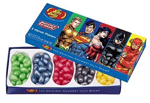 -. Feature : Justice League 4.25 oz gift box / five heroic flavors of delicious Jelly Belly jelly beans / shimmering and shiny versions of popular flavors / Very Cherry, Sour Apple, Wild Blackberry, Sour Lemon, and Blueberry / Each flavor is packed in individual bean shaped compartments filled with vivid color and flavors