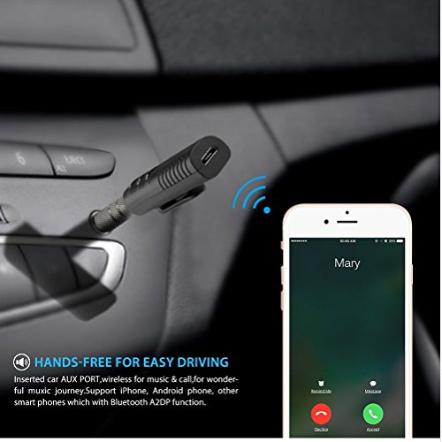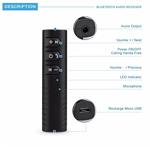 Type: Bluetooth Audio Receiver Material: Plastic Quantity: 1 pc Item Color: Black Bluetooth Version: 4.1 Frequency Range :2.4GHz Profile: A2DP Transmission Range: Up to 10m / 33ft I/O 3.5mm female plug, Mini USB female port Power Supply: DC 5V Charge Time: About 30 min Working Time: About 4h Size: 1.4*1.5*5.8cm / 0.5*0.6*2.3" (L*W*H)