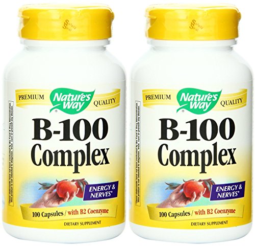B-100 Complex by Nature's Way 100 Capsule B-100 Complex 100 Capsule Product B-Vitamins are essential to the conversion of cellular energy manufacture of hormones and proteins as well as maintenance of nerve structures. Suggested Use As a dietary supplement Take 1 capsule daily preferably with food. - Or as directed by your healthcare professional. Supplement Facts Serving Size 1 Capsule Servings Per Container 100 Amount Per Serving Daily Value Thiamin (as Thiamin HCI) 100 mg 6667 Riboflavin (as riboflavin riboflavin 5-phosphate) 100 mg 5882 Niacin (as niacinamide) 100 mg 500 Vitamin B6 (as pyridoxine HCl pyridoxal 5-phosphate) 100 mg 5000 Folic Acid 400 mcg 100 Vitamin B12 (as cyanocobalamin triturate) 100 mcg 1667 Biotin (as biotin trituration) 100 mcg 33 Pantothenic Acid (as d-calcium pantothenate) 100 mg 1000 Inositol 100 mg Choline (as choline bitartrate) 25 mg Percent Daily Values are based on a 2 000 calorie diet Other Ingredients Gelatin (capsule) Cellulose Magnesium stearate WFeature
