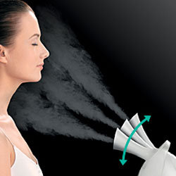 スチームをあてたいところに調整できる新機能アーム式ノズルを採用。ノズルの可動範囲が広がり(上下方向、ナショナル従来品比)、目もとから気になるデコルテ(胸もと)まで、肌を近づけなくてもリラックスした状態で広範囲にケアできるようになった